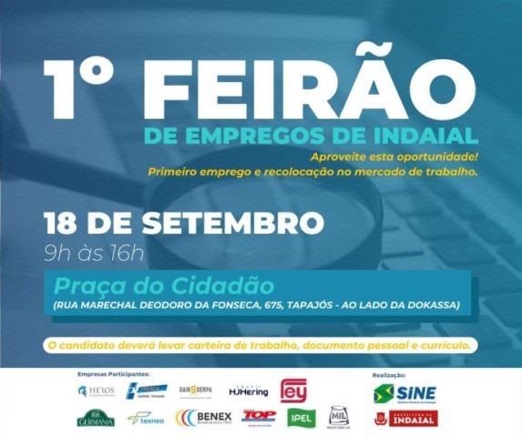 Neste sábado, 18 de setembro, a Prefeitura de Indaial irá realizar das 9h às 16h o 1º Feirão de Empregos, na Praça do Cidadão (rua Marechal Deodoro da Fonseca, 675, Tapajós - ao lado da Dokassa). O evento contará com a participação de 11 empresas de variados segmentos do Município, contabilizando mais de 280 vagas. A ação é organizada pela Coordenadoria de Desenvolvimento Econômico e Sine.