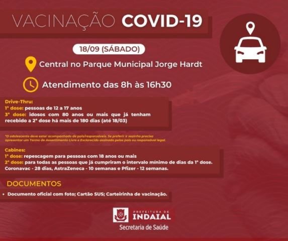 Neste sábado, 18 de setembro, a Secretaria de Saúde irá promover mais uma edição especial do Drive-Thru para vacinação contra a Covid-19. A ação acontecerá no Parque Municipal Jorge Hardt, das 8h às 16h30. Nesse formato estará disponível a aplicação da 1ª dose para pessoas de 12 a 17 anos e da 3ª dose para idosos com 80 anos ou mais que já tenham recebido a 2ª dose há mais de 180 dias (até 18 de março, por exemplo).