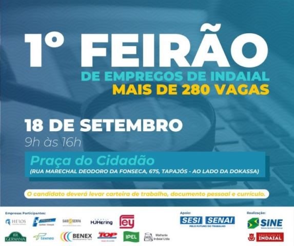 Neste sábado, 18 de setembro, a Prefeitura de Indaial irá realizar das 9h às 16h o 1º Feirão de Empregos, na Praça do Cidadão (rua Marechal Deodoro da Fonseca, 675, Tapajós - ao lado da Dokassa). O evento contará com a participação de 11 empresas de variados segmentos do Município, contabilizando mais de 280 vagas. A ação é organizada pela Coordenadoria de Desenvolvimento Econômico e Sine.