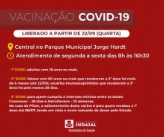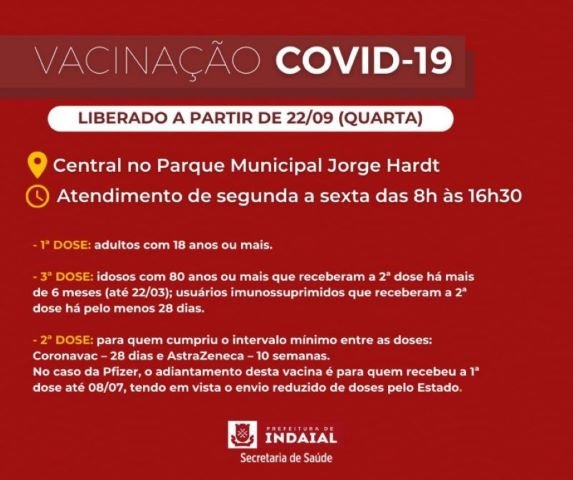 A partir desta quarta, 22 de setembro, a Secretaria de Saúde de Indaial irá reduzir o intervalo de dias para a 2ª dose da vacina Pfizer contra a Covid-19. Usuários que receberam a 1ª dose até 8 de julho já podem ser imunizados com a 2ª dose.