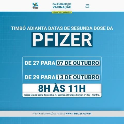 A Secretaria de Saúde de Timbó informa que irá adiantar dois dias da segunda dose da vacina Pfizer contra Covid-19. O adiantamento irá acontecer pois o município recebeu doses especificamente para isso. Confira quais as datas serão adiantadas: