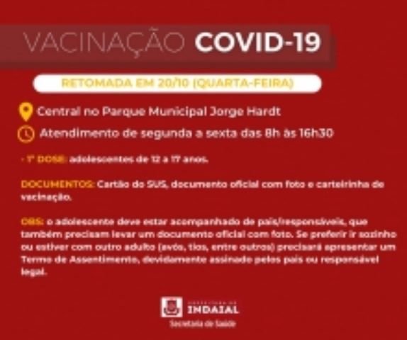 Com o envio de novas doses contra a Covid-19 pelo Estado destinadas ao público de adolescentes, a partir desta quarta, 20 de outubro, a Secretaria de Saúde de Indaial reabre a aplicação da 1ª dose para usuários de 12 a 17 anos. O atendimento é realizado na Central instalada no Parque Municipal Jorge Hardt, por ordem de chegada, através de senhas, de segunda a sexta, das 8h às 16h30.