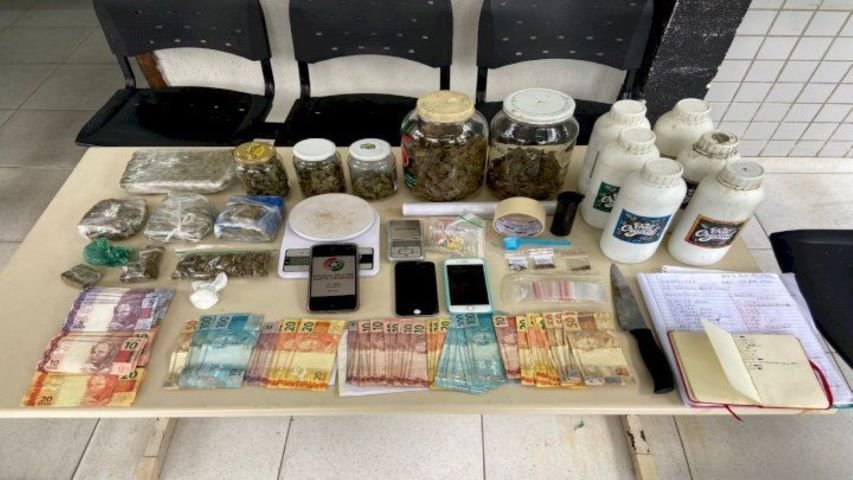 envolvido foi preso e, em buscas na propriedade, a guarnição localizou 1,5 quilo de maconha, 10 gramas de cocaína, R$ 1,330,00 em espécie, dois celulares, 241 cédulas falsas de real, sementes e fertilizantes para plantio de maconha, além de anotações e petrechos utilizados para o tráfico de drogas.