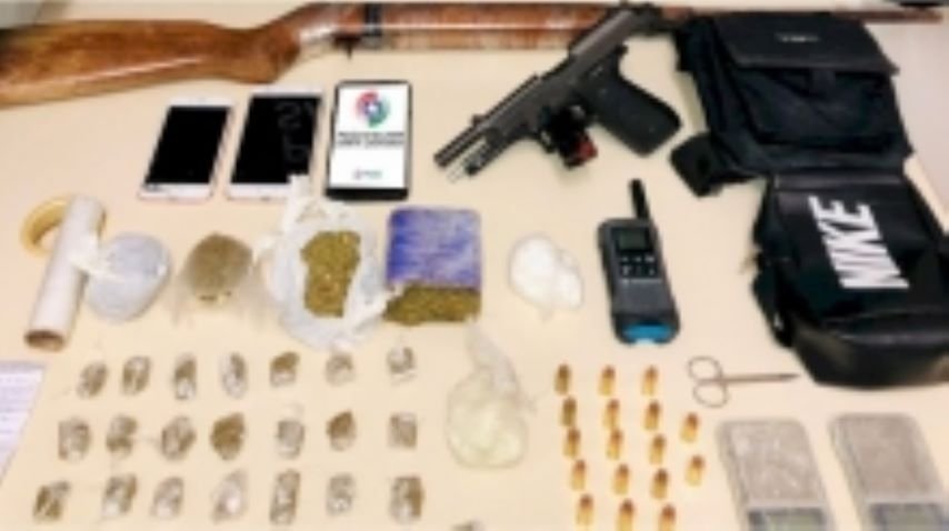 No patrulhamento, os policias visualizaram pessoas em atitude suspeita que fugiram ao visualizarem a viatura. No local, foram encontrados uma pistola e 17 munições de calibre 9mm, uma espingarda de pressão, 374 gramas de maconha, 45 gramas de cocaína, 39 gramas de crack, duas balanças de precisão e materiais para embalar as drogas.