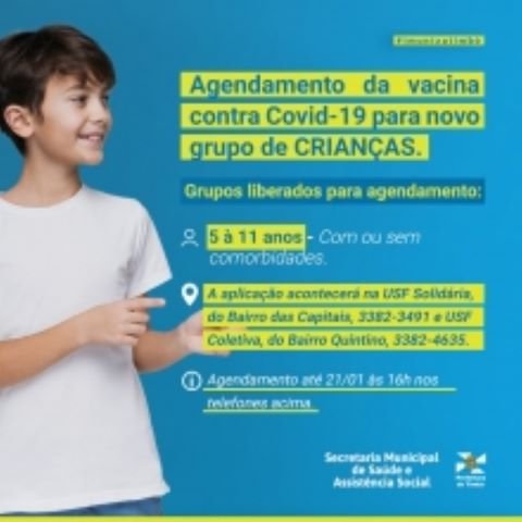 A Secretaria de Saúde de Timbó informa que todos os grupos de crianças estão liberados para agendar a vacina da Covid-19: entre 5 e 11 anos com e sem comorbidades.
