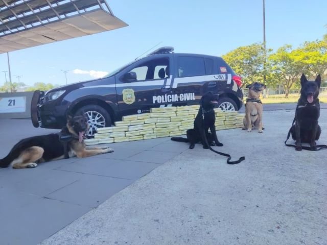 Com os cães, foram localizados no bagageiro de um ônibus que vinha de Foz do Iguaçu 120 tabletes de maconha – a estimativa é que atinjam cerca de 90 quilos da droga. A carga estava acondicionada em quatro fardos de capas de veículos.