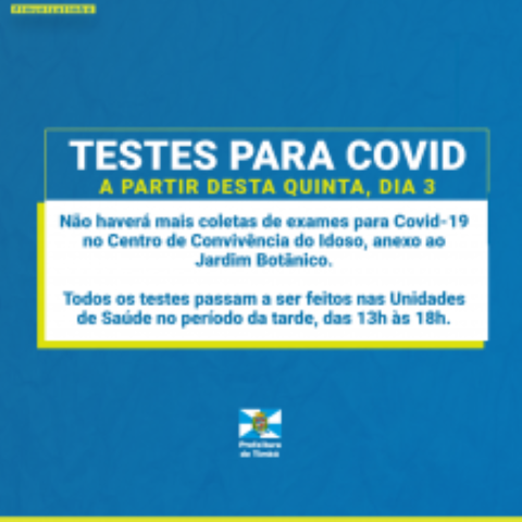 A Secretaria de Saúde de Timbó informa que a partir desta quinta-feira, dia 03 de fevereiro, não haverá mais coletas de exames para Covid-19 no Centro de Convivência do Idoso, anexo ao Jardim Botânico. Todos os testes passam a ser feitos nas Unidades de Saúde no período da tarde, das 13h às 18h.