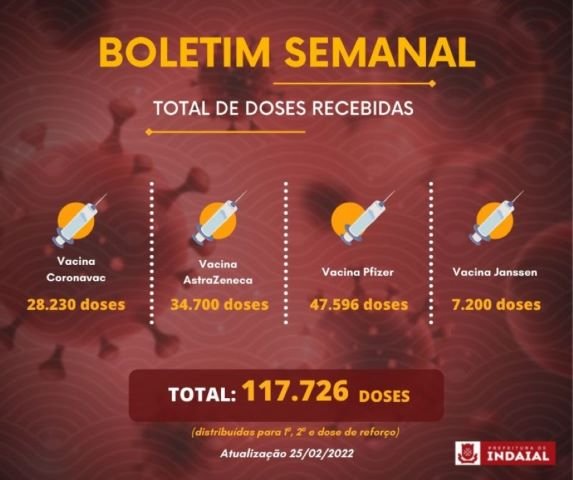 Com dados do dia 25 de fevereiro, sexta-feira, Indaial recebeu um total de 117.726 doses das vacinas contra a COVID-19. Foram 28.230 doses de Coronavac, 34.700 de AstraZeneca, 47.596 de Pfizer e cerca de 7.200 de Janssen.