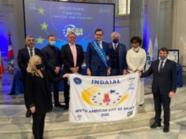 Esta segunda, 21 de março, é dia de comemoração dupla para Indaial. O Município, além de celebrar seus 88 anos de emancipação político-administrativa, é agraciado, na Itália, com o reconhecimento internacional de Cidade Sul-Americana do Desporto 2022. O prefeito, André Moser, acompanhado do diretor-presidente da Fundação Municipal de Esportes, Ademir Packer, esteve no evento, recebendo o título chancelado pelo Parlamento Europeu e Unesco.