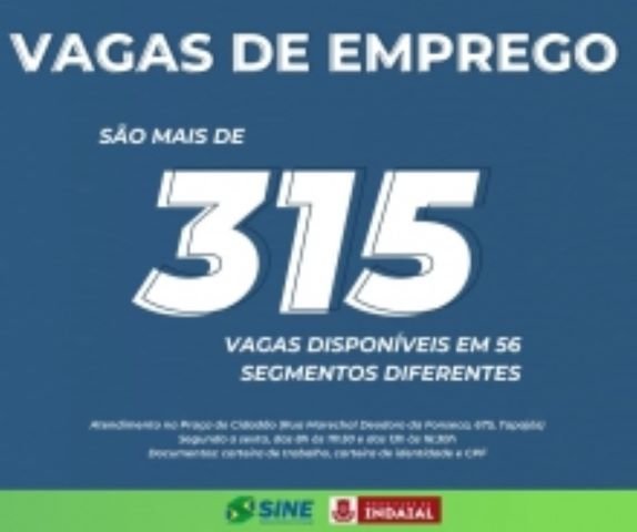 O Sine de Indaial anuncia mais de 315 vagas de emprego disponíveis em 56 segmentos diferentes, confira:
