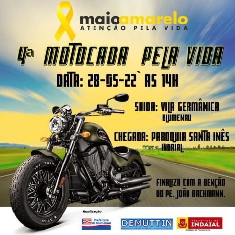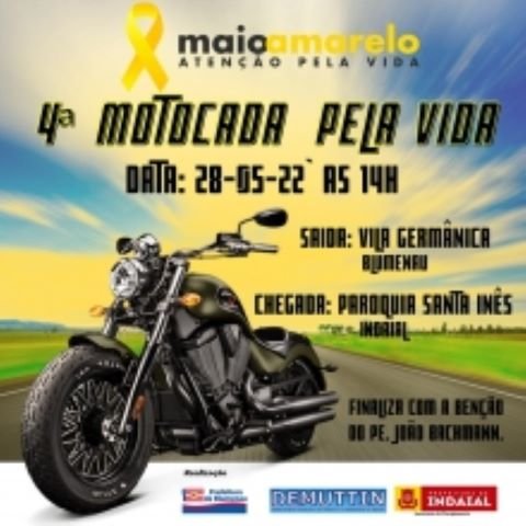 A Secretaria de Planejamento de Indaial, através do Departamento Municipal de Trânsito e Transporte (Demuttin), promoverá no dia 28 de maio a 4ª Motocada Pela Vida. A ação é alusiva ao mês de conscientização do Maio Amarelo, voltado ao trânsito mais seguro.