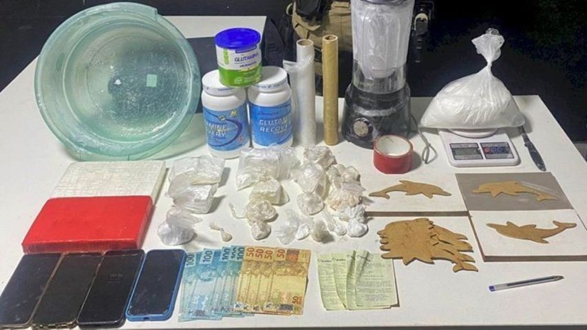 Dentro do imóvel foi localizado e apreendido três prensas montadas, um invólucro plástico contendo 1 kg de substância de pó branco indefinido (mistura), 14 porções de cocaína, pesando no seu total 764 gramas, três potes de glutamina, pesando 2.129 gramas, um rolo de fita adesiva, um rolo saco plástico transparente, um rolo plástico filme, um liquidificador, um colher, um faca, todos esses utensílios com resquícios de cocaína, cinco formas para prensa, cinco placas para prensa e uma balança de precisão.