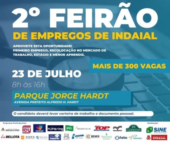 No dia 23 de julho (sábado), a Prefeitura de Indaial, através da Coordenadoria de Desenvolvimento Econômico e Sine, promoverá o 2º Feirão de Empregos, das 8h às 16h, no Parque Municipal Jorge Hardt – Ribeirão das Pedras (Av. Prefº Alfredo H. Hardt). O evento contabilizará mais de 300 vagas disponibilizadas por empresas da cidade, entre oportunidades para primeiro emprego, recolocação no mercado, estágio e menor aprendiz.