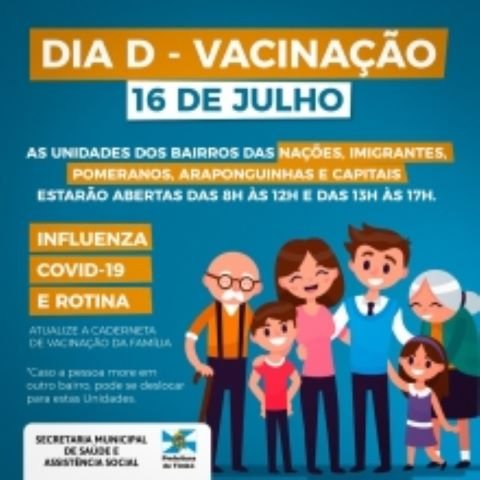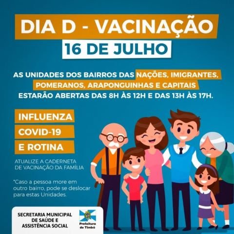 Neste sábado, dia 16 de julho, cinco Unidades de Saúde de Timbó estarão abertas para vacinação. Será feita a aplicação de todas as vacinas de rotina, para crianças e adultos, inclusive das vacinas contra Influenza e Covid-19.