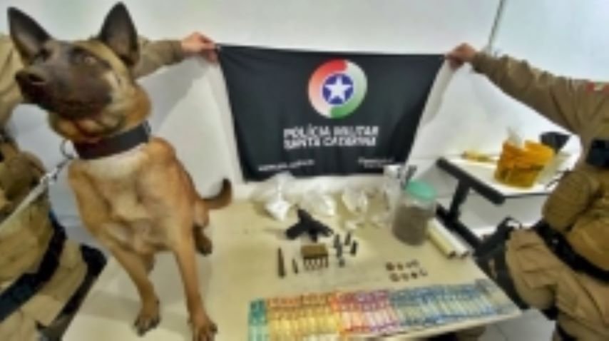 Quando questionado, o abordado falou ser usuário de maconha e apresentou uma porção contendo aproximadamente 400 gramas. No entanto, durante as buscas pelo imóvel com o apoio do Cão de Faro da PMSC, foi localizado uma caixa contendo 50 munições de calibre 380, uma pistola calibre 380, com numeração suprimida e carregada com 10 munições do mesmo calibre.