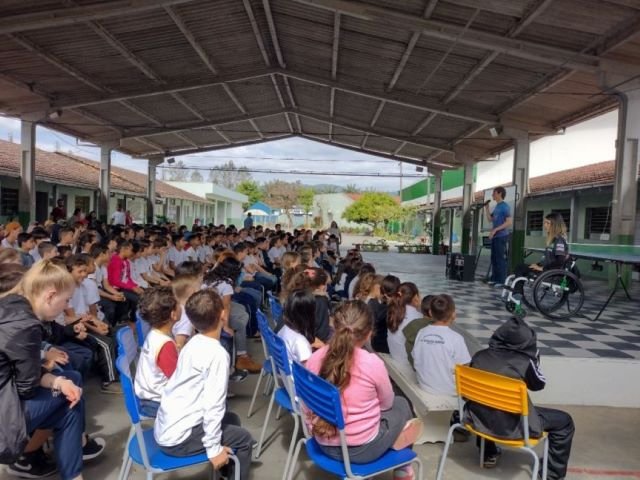 Na última quinta-feira (25), alunos da EBM Leopoldo Simão participaram de uma integração com representantes da Apesblu (Associação de Paradesporto de Blumenau). Na escola, estiveram presentes o técnico do Tênis de Mesa Paralímpico, Deois Kalvelage, e a paratleta da modalidade, bem como da Bocha Paralímpica, Andreia Porfirio. Após apresentarem aos estudantes o Programa Paradesporto, os profissionais realizaram demonstrações de Goalball e também do próprio Tênis de Mesa.