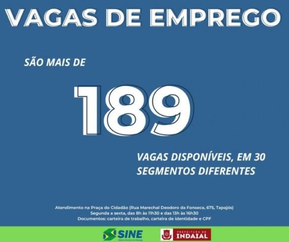 O Sine de Indaial comunica que há mais de 189 vagas de emprego disponíveis em 30 segmentos diferentes. Confira as vagas disponíveis: