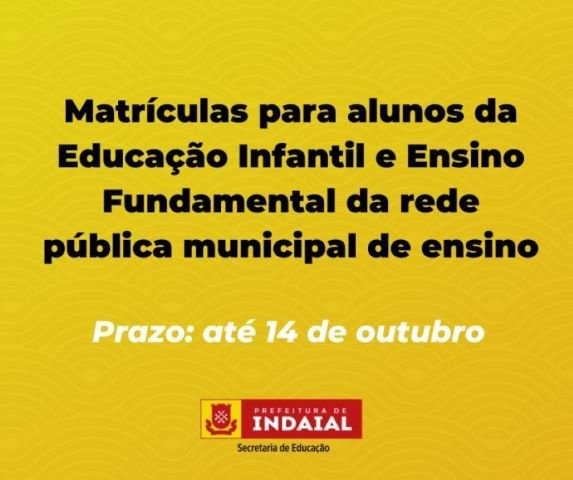 A Secretaria de Educação de Indaial abriu na segunda-feira, 3 de outubro, as matrículas para alunos da Educação Infantil e Ensino Fundamental da rede pública municipal de ensino. O prazo para inscrição é até o dia 14 deste mês.