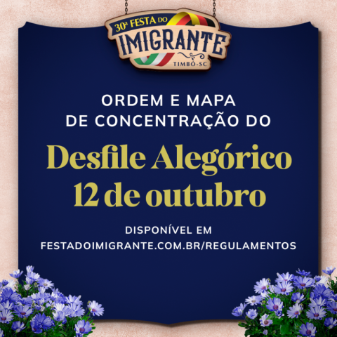 Todos os grupos que participarão do Desfile Alegórico de 12 de outubro deverão se posicionar conforme mapa de concentração que está disponível aqui. Acesse aqui a lista da ordem do desfile e o regulamento. “Brindes, mesmo que sejam balas, durante o desfile, só podem ser entregues em mãos ao público”, destacou em reunião o presidente da CCO da 30ª Festa do Imigrante, Jorge Ferreira.