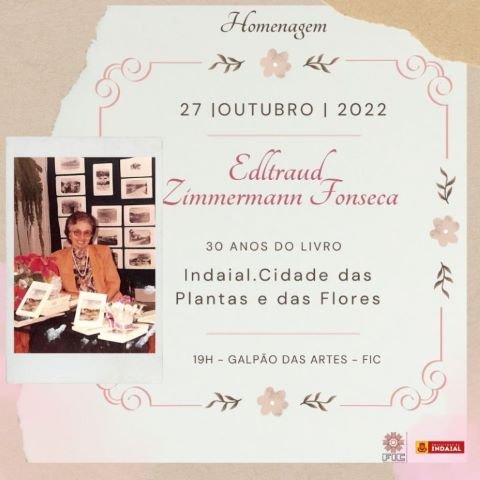 No dia 27 de outubro (quinta-feira), o Galpão das Artes da Fundação Indaialense de Cultura sediará dois eventos: homenagem para uma escritora da cidade e lançamento de livro. Primeiramente, às 19h, será realizada uma homenagem à escritora Edltraud Zimmermann Fonseca pelos 30 anos do Livro "Indaial. Cidade das Plantas e das Flores".