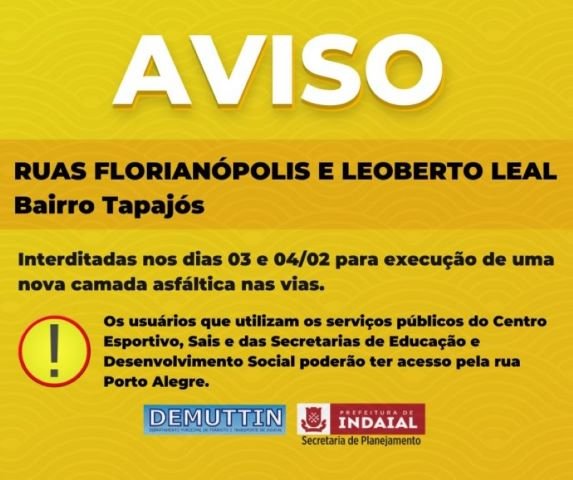 A Secretaria de Planejamento de Indaial informa que nesta sexta (3) e sábado (4) as ruas Florianópolis e Leoberto Leal, no bairro Tapajós, estarão interditadas para execução de uma nova camada asfáltica nas vias. Os usuários que utilizam os serviços públicos do Centro Esportivo, Sais e das Secretarias de Educação e Desenvolvimento Social poderão ter acesso pela rua Porto Alegre.