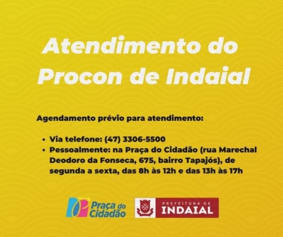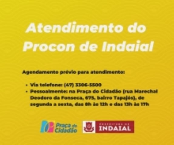 A partir de agora o atendimento prestado pelo Procon de Indaial será realizado mediante agendamento prévio dos consumidores, o qual pode ser marcado pelo telefone (47) 3306-5500 ou pessoalmente na Praça do Cidadão (rua Marechal Deodoro da Fonseca, 675, bairro Tapajós), de segunda a sexta, das 8h às 12h e das 13h às 17h.