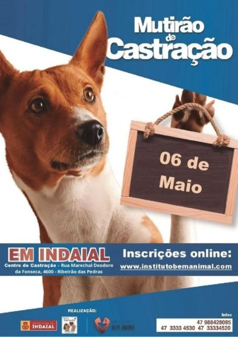 Estão abertas as inscrições para o terceiro Mutirão de Castração Animal de 2023, uma parceria da Prefeitura de Indaial com o Instituto Bem Animal. A ação acontecerá no sábado do dia 6 de maio. Gatos e cães poderão ser castrados. No caso de cães, as exceções são para as raças pug, bulldog, pequinês e lulu-da-pomerânia. A cirurgia ocorrerá no Centro Público (rua Marechal Deodoro da Fonseca, 4.600).
