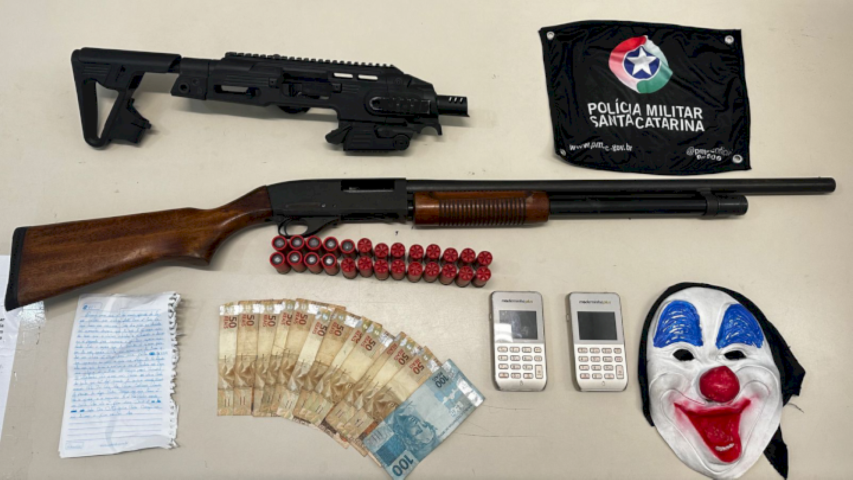 Ao averiguar a situação, os policiais abordaram o automóvel com três ocupantes. Após busca pessoal e no veículo, foi encontrada uma espingarda calibre 12, um kit Roni (que transforma uma pistola em uma arma longa), 26 cartuchos de calibre 12, duas máquinas de cartão e R$ 750,00.