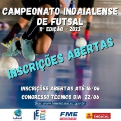 Seguem abertas até sexta-feira, 16 de junho, as inscrições do 11º Campeonato Indaialense de Futsal, promovido pela Fundação Municipal de Esportes. O Congresso Técnico acontecerá no dia 22, às 19h, na sede da FME (rua Leoberto Leal, Tapajós). A competição deve iniciar no dia 29 de junho.