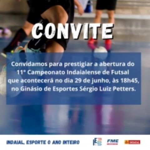 Nesta quinta, 29, ocorrerá a abertura do 11º Campeonato Indaialense de Futsal, promovido pela Fundação Municipal de Esportes. A solenidade será às 18h45, no Ginásio de Esportes Sérgio Luiz Petters.