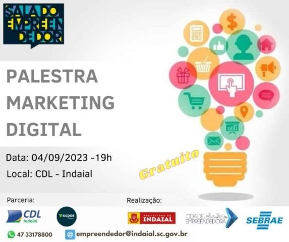 A Sala do Empreendedor de Indaial irá promover no dia 4 de setembro uma palestra sobre Marketing Digital ministrada por consultor do Sebrae, às 19h, na CDL (Rua Dr. Blumenau, 286, Sol). Inscrições gratuitas pelo link: https://www.sympla.com.br/palestra-marketing-digital__2111137
