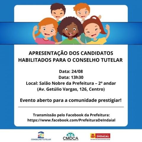 Nesta quinta, 24 de agosto, será realizada a apresentação dos candidatos habilitados para o processo de escolha de novos membros do Conselho Tutelar de Indaial. O encontro, aberto à comunidade, acontecerá às 13h30, no Salão Nobre da Prefeitura (Av. Getúlio Vargas, 126, Centro).
