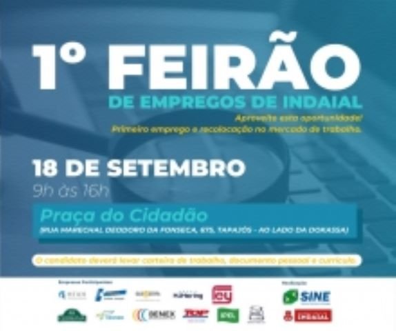 Neste sábado, 18 de setembro, a Prefeitura de Indaial irá realizar das 9h às 16h o 1º Feirão de Empregos, na Praça do Cidadão (rua Marechal Deodoro da Fonseca, 675, Tapajós - ao lado da Dokassa). O evento contará com a participação de 11 empresas de variados segmentos do Município, contabilizando mais de 280 vagas. A ação é organizada pela Coordenadoria de Desenvolvimento Econômico e Sine.