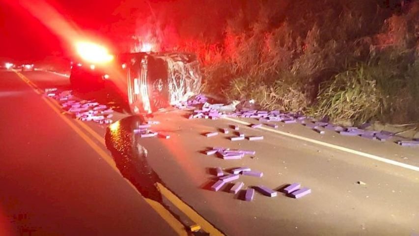 Durante a fuga, para tentar escapar da abordagem, o motorista acabou perdendo o controle do veículo e capotou sobre a rodovia em uma curva. Parte da droga se espalhou pela pista.