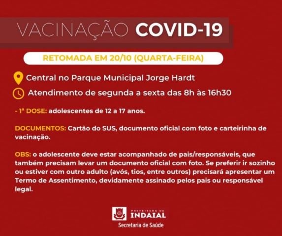 Com o envio de novas doses contra a Covid-19 pelo Estado destinadas ao público de adolescentes, a partir desta quarta, 20 de outubro, a Secretaria de Saúde de Indaial reabre a aplicação da 1ª dose para usuários de 12 a 17 anos. O atendimento é realizado na Central instalada no Parque Municipal Jorge Hardt, por ordem de chegada, através de senhas, de segunda a sexta, das 8h às 16h30.