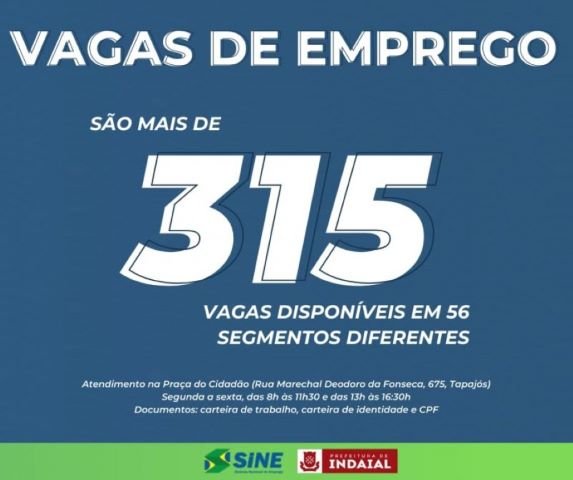 O Sine de Indaial anuncia mais de 315 vagas de emprego disponíveis em 56 segmentos diferentes, confira: