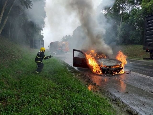 Um Veículo GM/Chevrolet Vectra vermelho, pegou fogo na manhã desta segunda-feira, (04) na BR-116, K-59, próximo ao trevo de acesso à cidade de Major Vieira, no bairro Floresta São João, em Papanduva.