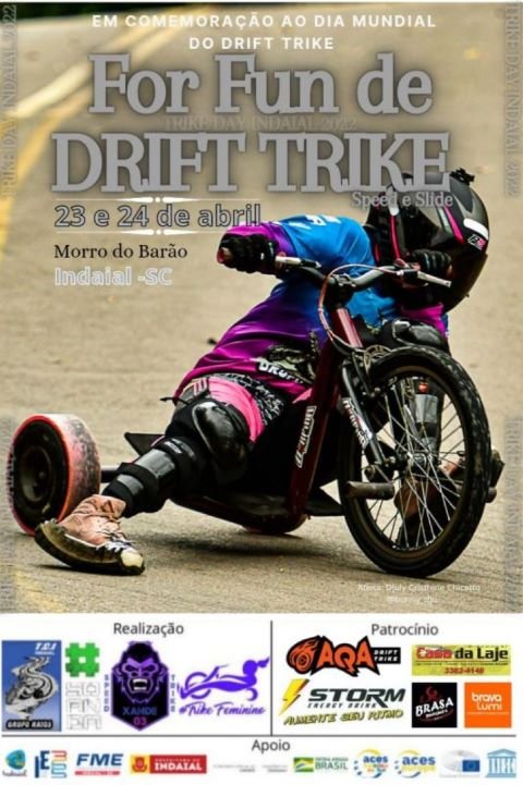 Considerado um esporte radical, o Drift Trike consiste em descer ladeiras em alta velocidade num percurso com curvas desafiadoras. “Indaial é a Cidade Sul-Americana do Desporto e contempla diversas modalidades. Todos são convidados a prestigiar o circuito”, diz o diretor-presidente da FME, Ademir Packer. O acesso do público ao evento é livre, sem cobrança de ingresso.