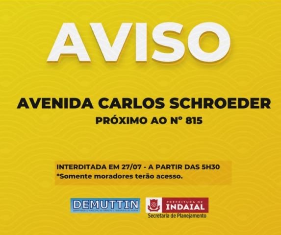 O Departamento de Trânsito informa que nesta quarta, 27, a Casan de Indaial irá realizar manutenção em uma rede de esgoto na Avenida Carlos Schroeder, próximo ao número 815. Devido à complexidade do serviço e a fim de manter a segurança para trabalho no local, será necessário interromper o trânsito nessa via. Acesso local somente aos moradores. Os trabalhos iniciam às 5h30 e irão se estender ao longo do dia.