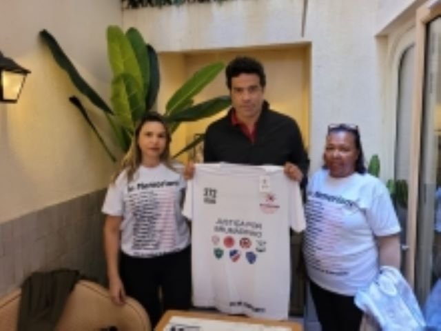 As representantes da associação presentearam o ex-jogador com duas camisetas em que aparecem estampados a frase “Justiça por Brumadinho” e os escudos de sete times de futebol amador onde atuavam vítimas da tragédia-crime, considerada o maior acidente de trabalho da história brasileira. Ele também recebeu, das mãos das representantes da AVABRUM, duas outras camisetas em que estão estampados os nomes destas vítimas, além das palavras “in memorian” e “272 joias”.