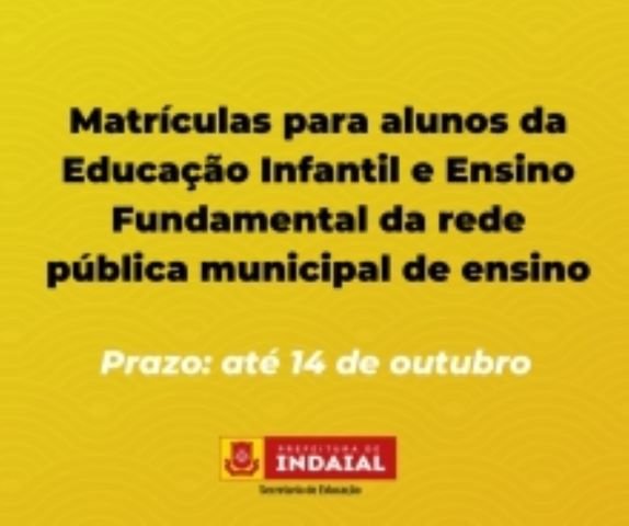 A Secretaria de Educação de Indaial abriu na segunda-feira, 3 de outubro, as matrículas para alunos da Educação Infantil e Ensino Fundamental da rede pública municipal de ensino. O prazo para inscrição é até o dia 14 deste mês.