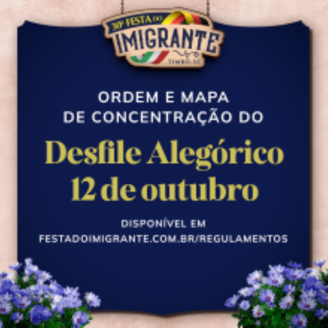 Todos os grupos que participarão do Desfile Alegórico de 12 de outubro deverão se posicionar conforme mapa de concentração que está disponível aqui. Acesse aqui a lista da ordem do desfile e o regulamento. “Brindes, mesmo que sejam balas, durante o desfile, só podem ser entregues em mãos ao público”, destacou em reunião o presidente da CCO da 30ª Festa do Imigrante, Jorge Ferreira.