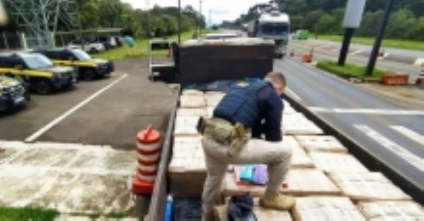 A droga era transportada na carroceria de um caminhão com placas de Palhoça/SC. O motorista de 43 anos foi preso.