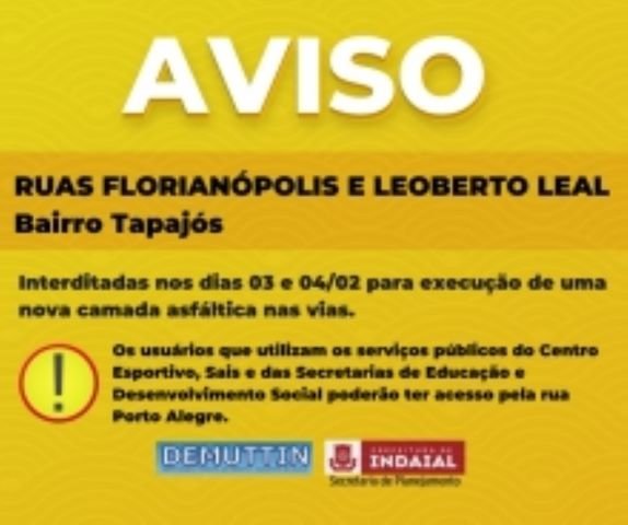 A Secretaria de Planejamento de Indaial informa que nesta sexta (3) e sábado (4) as ruas Florianópolis e Leoberto Leal, no bairro Tapajós, estarão interditadas para execução de uma nova camada asfáltica nas vias. Os usuários que utilizam os serviços públicos do Centro Esportivo, Sais e das Secretarias de Educação e Desenvolvimento Social poderão ter acesso pela rua Porto Alegre.