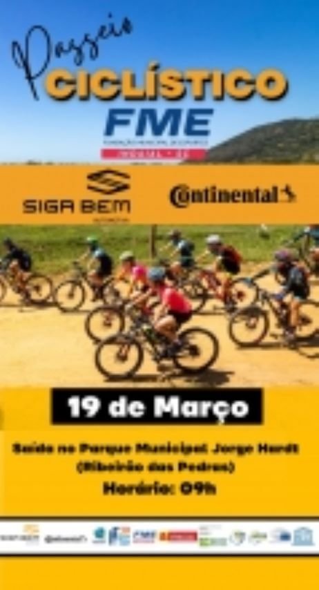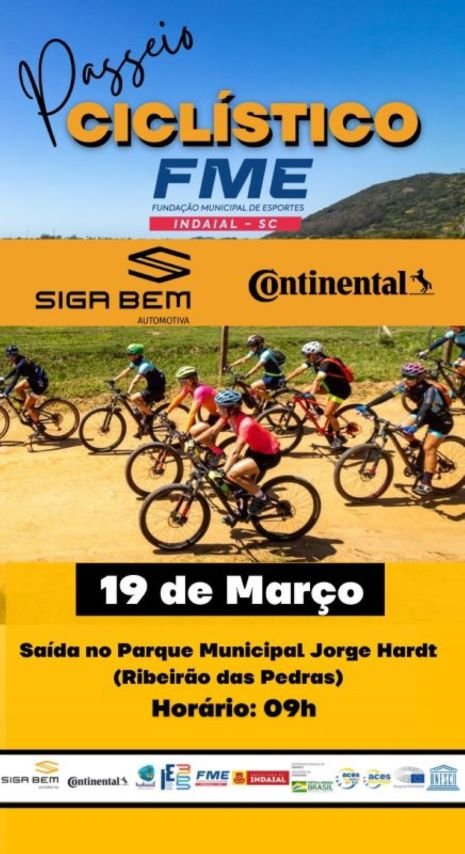A Fundação Municipal de Esportes promoverá no dia 19 de março um passeio ciclístico gratuito para a comunidade. O trajeto terá de 15 km com saída do Parque Municipal Jorge Hardt, às 9h. As inscrições podem ser feitas no link: https://forms.gle/xDsQPgEVMF8y6WHK9