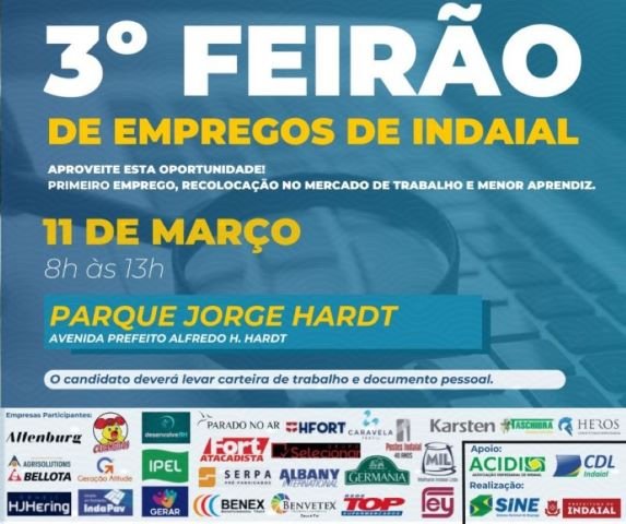 A Prefeitura de Indaial, através da Coordenadoria de Desenvolvimento Econômico e Sine, irá realizar a terceira edição do Feirão de Empregos neste sábado, 11 de março, das 8h às 13h, no Parque Municipal Jorge Hardt – Ribeirão das Pedras. O evento, com parceria da Associação Empresarial (Acidi) e Câmara de Dirigentes Lojistas (CDL), tem o objetivo de reunir empresas e pessoas que estão à procura de trabalho no mercado e, ao mesmo tempo, suprir as vagas disponíveis.