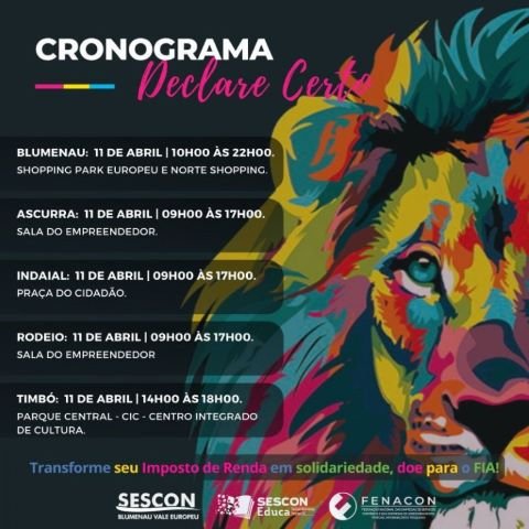 A Praça do Cidadão sediará no dia 11 de abril, das 9h às 17h, o evento “Declare Certo”, promovido pelo Sescon Blumenau Vale Europeu. O objetivo é tirar dúvidas dos contribuintes sobre o preenchimento da Declaração de Imposto de Renda da Pessoa Física (DIRPF), que deve ser efetuada até 31 de maio deste ano.