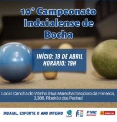 O 10° Campeonato Indaialense de Bocha, promovido pela Fundação Municipal de Esportes, terá início nesta quarta, 19 de abril, às 19h, na Cancha do Vitinho (rua Marechal Deodoro da Fonseca, 3.366, Ribeirão das Pedras).