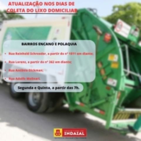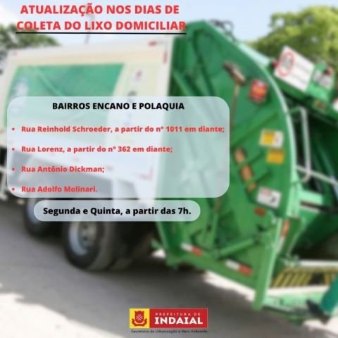 A Secretaria de Urbanização e Meio Ambiente de Indaial informa que haverá uma atualização nos dias de coleta do lixo domiciliar em determinadas ruas dos bairros Encano e Polaquia. São elas: Rua Reinhold Schroeder, a partir do n° 1011 em diante; Rua Lorenz, a partir do n° 362 em diante; Rua Antônio Dickman e Rua Adolfo Molinari. A coleta nesses locais ocorrerá nas segundas e quintas, a partir das 7h.