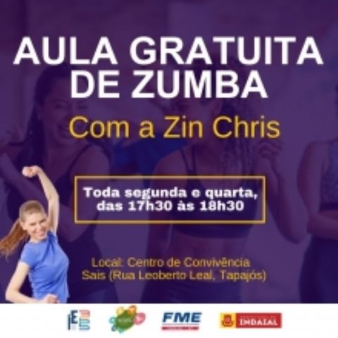 A partir do próximo dia 11 de setembro a Fundação Municipal de Esportes amplia o leque de modalidades do Programa Semente com aulas gratuitas de Zumba. A atividade será realizada no Centro de Convivência, fundos do Sais, na rua Leoberto Leal, Tapajós. As aulas acontecerão toda segunda e quarta, das 17h30 às 18h30, com a Zin Chris.